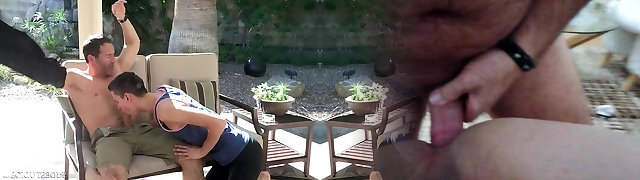 Hardcore outdoors gay three-way with a mature dude giving head