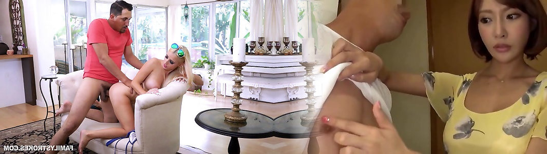 Naughty blonde seduces hot Asian hunk and gets bent over her table